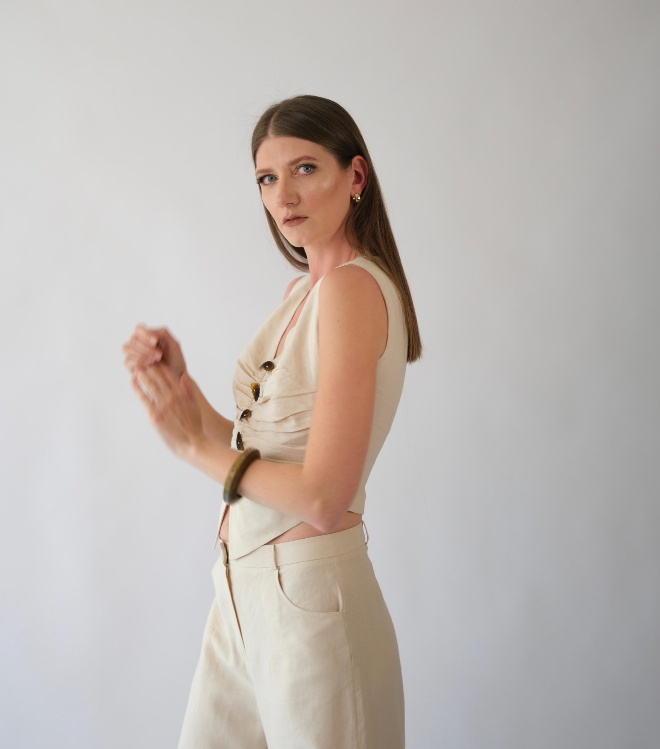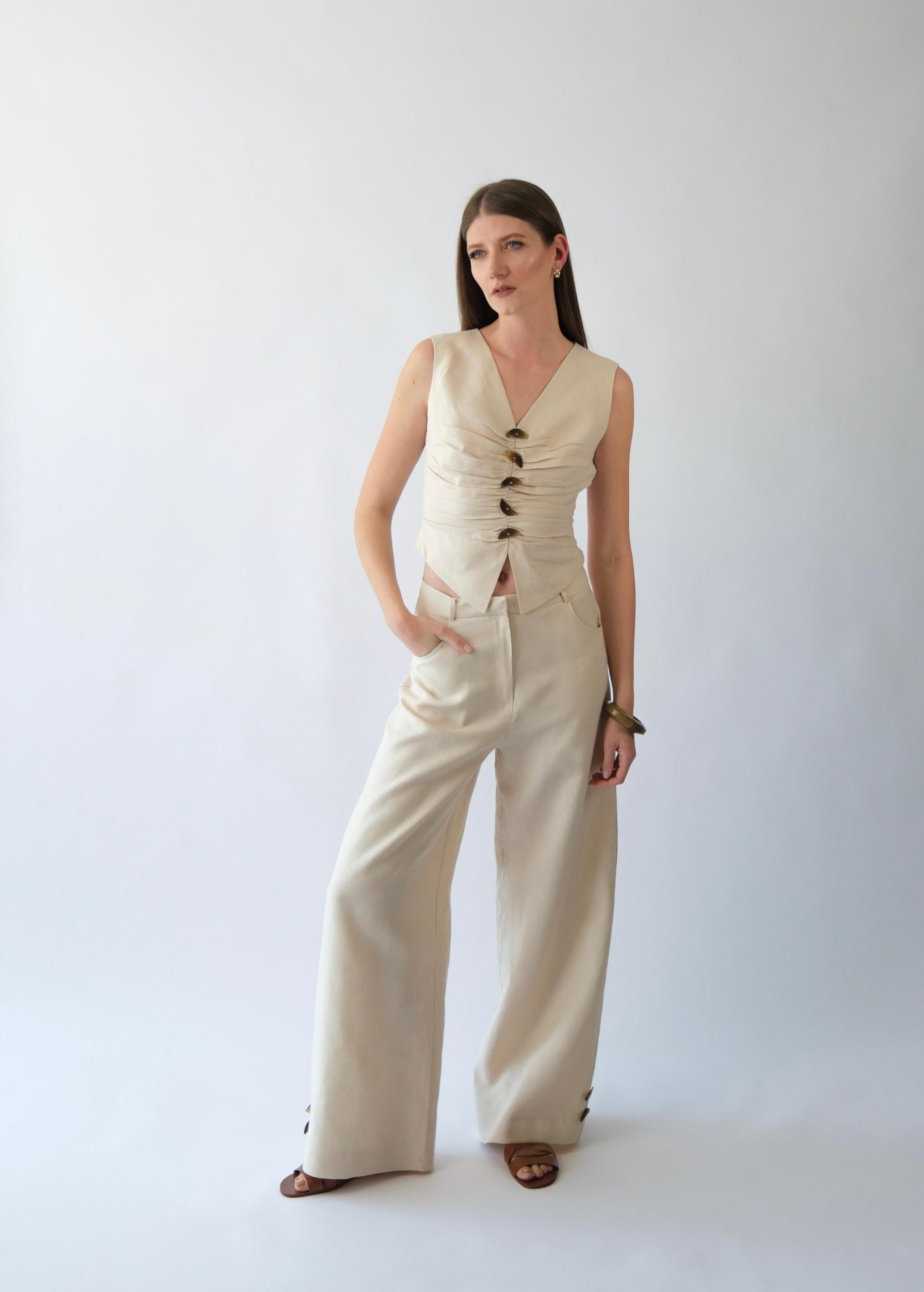 Ekru keten büzgülü yelek